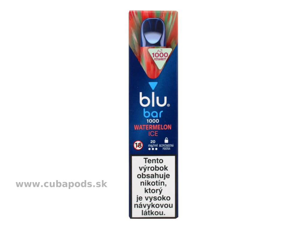 Naša nová jednorazová elektronická cigareta Blu Bar 1000 je moderné a štýlové zariadenie, ktoré prináša zážitok z vapovania lepší ako kedykoľvek predtým v príchuti červeného melóna so sviežim nádychom.Kapacita až 1000 potiahnutí, koncentrácia nikotínu 20mg/ml, obsah náplne 2ml. Blu Bar obsahuje patentovanú technológiu mriežkového zahrievača Blu FlavourTech™ pre ešte intenzívnejšiu chuť.